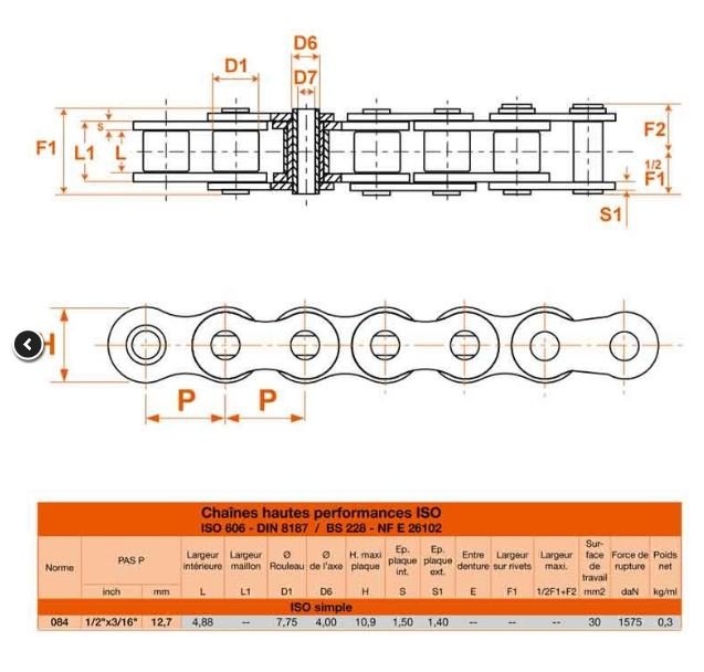 Chaine à rouleaux simple en acier (chaine standard). Elle est de norme Européenne (ISO) 084 et a un pas de 12,7mm.