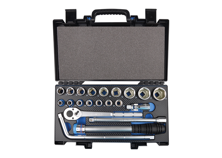 Poignée ajustable brevetée, spéciale effort Cliquet avec angle de reprise de 11° Métrique Douilles 6 pans Coffret en plastique 820003K EVA #8 (375 x 186 mm)