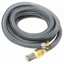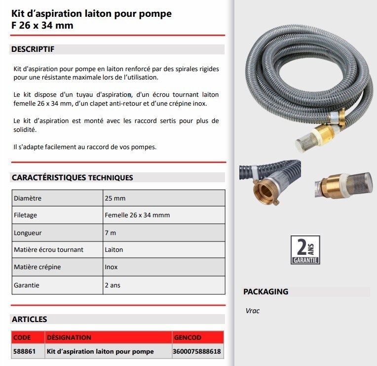 Kit d'aspiration pour pompe dispose d'un tuyau d'aspiration, d'un écrou tournant laiton femelle 26 x 34 mm, d'un clapet anti-retour et d'une crépine inox.