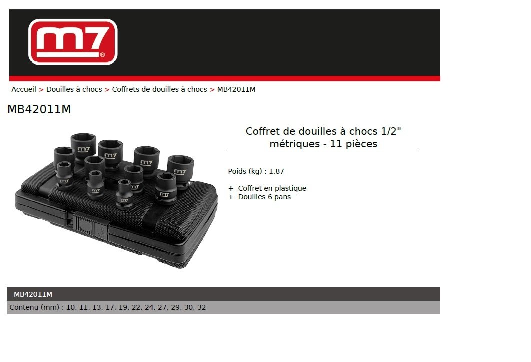 M7 - Coffret de 11 douilles impact 1/2" - 10 à 32mm King Tony