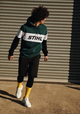 Sweat à capuche vert, noir et blanc pour homme, avec logo STIHL sur le devant. 100% coton. Disponible du S au XXL.